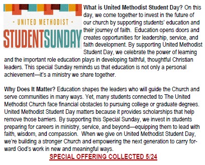 United Methodist Student Day-Special Offering 5/24